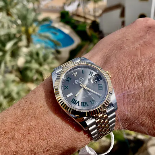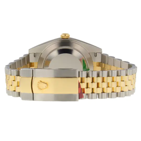 41mm Yellow Rolesor case with 904L steel monobloc middle case, screw-down steel back, 18K yellow gold screw-down crown, 18K yellow gold fluted bezel, scratch-resistant double anti-reflective sapphire crystal with cyclops lens over the date, champagne dial, index hour markers, Rolex caliber 3235 perpetual self-winding movement with date at 3 o'clock that changes instantaneously at midnight in a few thousandths of a second, approximately 70 hours of power reserve, yellow Rolesor Jubilee bracelet made from a combination of 904L steel and 18K yellow gold with five-piece links, folding Oysterclasp buckle with Easylink 5mm comfort extension link. Waterproof to 100 meters.