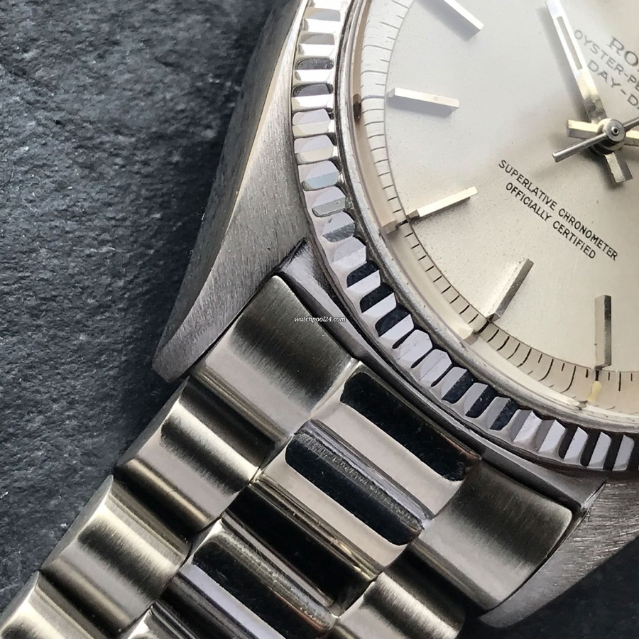 The Oyster case has a thick profile with sharp edges. The lugs show the original brushed surface. Also the white gold fluted bezel has been greatly preserved. This watch is accompanied by the white gold President bracelet. It has been very well preserved and has the early and rare Rolex folding clasp. This Day-Date is powered by the highly reliable 1556 automatic caliber.