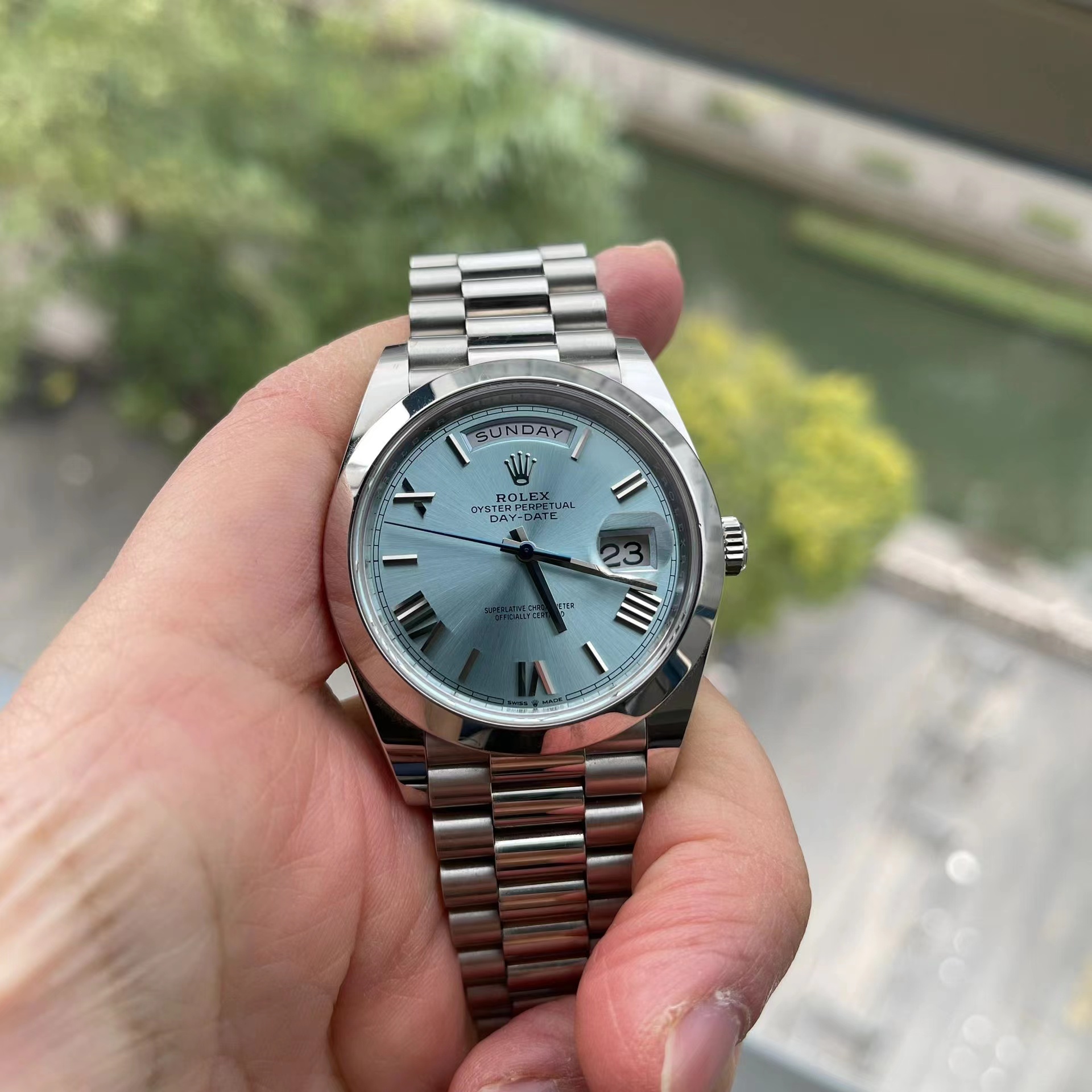 40mm platinum case, screw-down back, screw-down crown with twinlock double waterproofness system, smooth bezel, scratch-resistant sapphire crystal with cyclops lens over the date, ice blue dial, Roman numerals, Rolex calibre 3255 perpetual self-winding movement with centre hour, minute and seconds hands instantaneous day and date in apertures, unrestricted rapid-setting, and stop-seconds for precise time setting, approximately 70 hours of power reserve, President bracelet with semi-circular three-piece links, concealed folding Crownclasp buckle. Waterproof to 100 metres / 330 feet.
