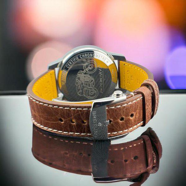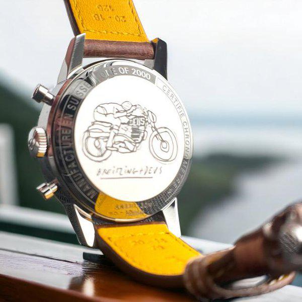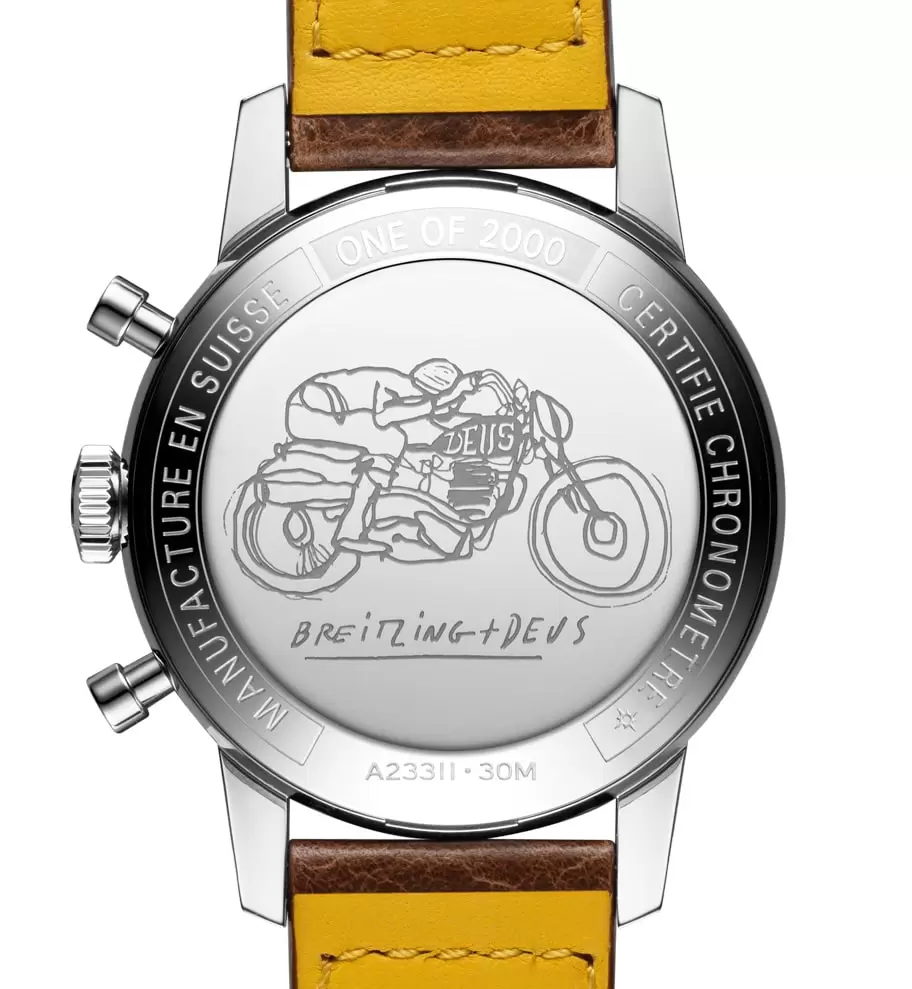 Featuring a 41-millimetre stainless-steel case matched to a brown racing-themed calfskin leather strap, the Top Time Deus features yellow and orange details, a lightning-bolt-shaped chronograph hand on top of squircle-shaped chronograph counters, Deus’ adage “In benzin veritas” and a retro-looking motorcyclist in rally racer mode – by Deus creative director Carby Tuckwell – engraved on the caseback. Limited to 2000 pieces, this Top Time is powered by the Breitling Caliber 23, a COSC-certified chronometer.