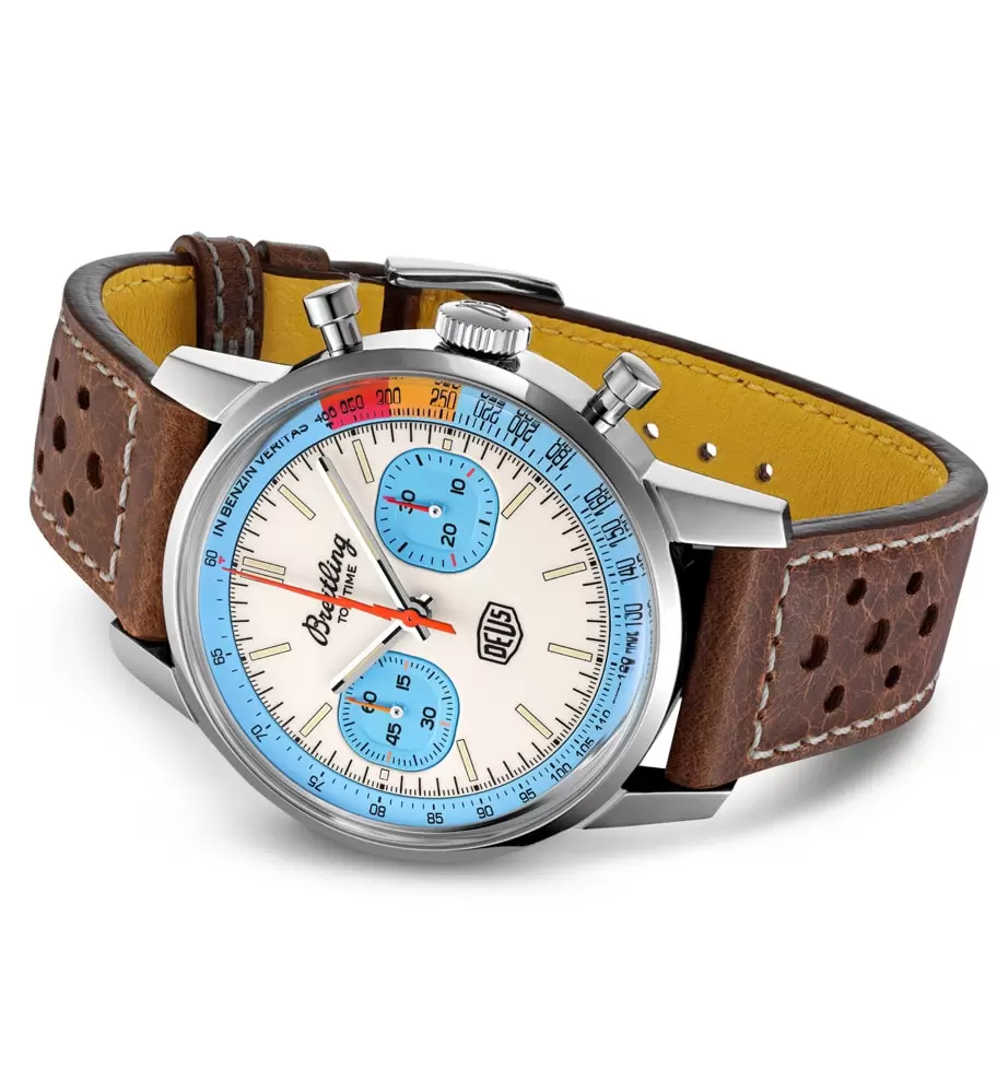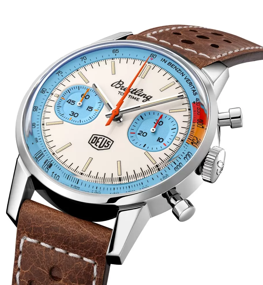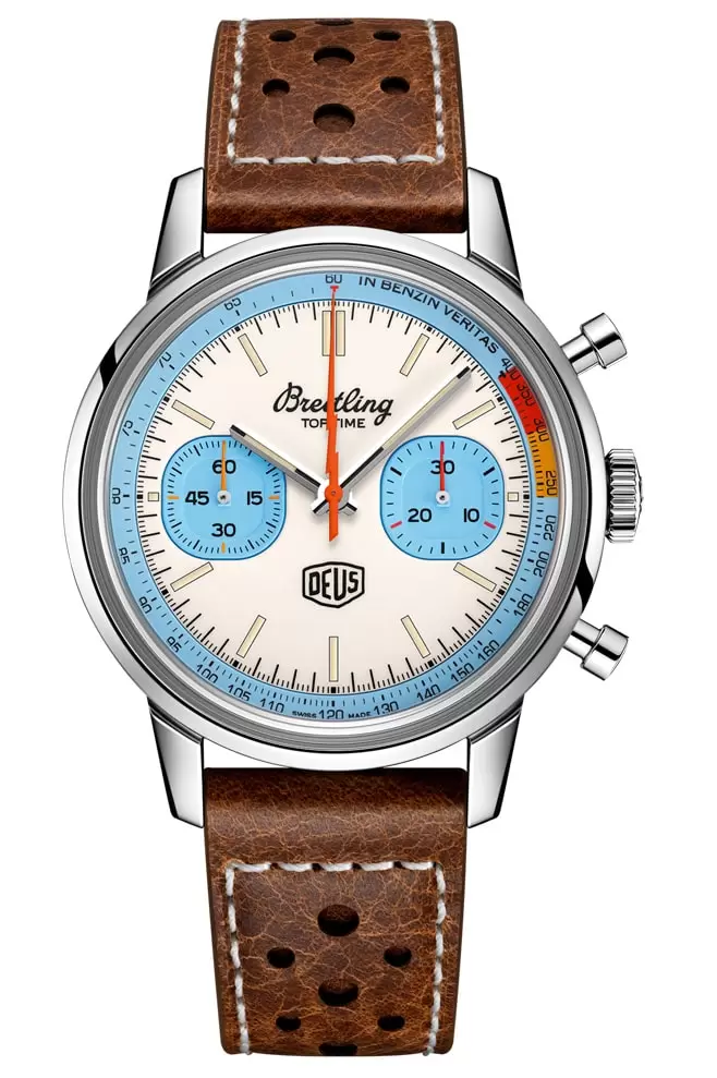 Co-designed with Australian lifestyle brand Deus Ex Machina, the custom motorcycle and surf outfitter, the Top Time Deus is a nod to Breitling’s original 1960s watch and a true tribute to the nomad spirit. Originally launched in the 1960s, the Top Time had a clear mission: to suit the needs of “the young and active professionals” with a range of “ultra-modern chronographs”.