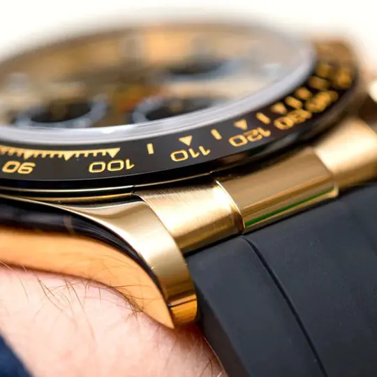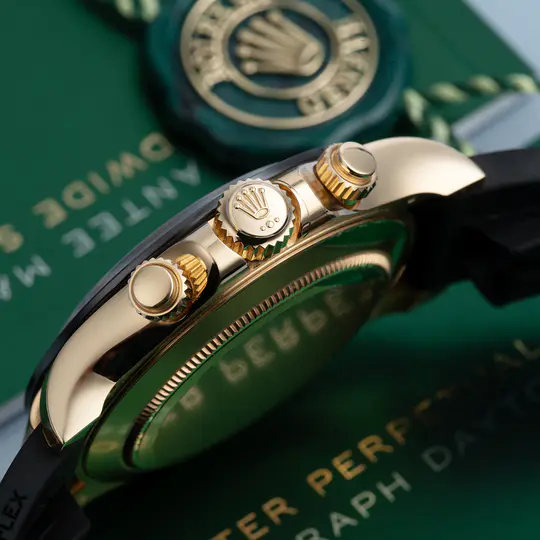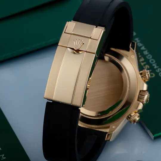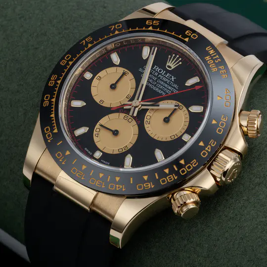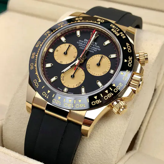 Rolex Cosmograph Daytona, 18k Yellow Gold 40mm watch, Reference 116518ln-0047. This model has Black Paul Newman dial with Champagne sub-dials. Applied Yellow Gold rimmed index hour markers with luminous fill. Hour and minute hands of polished 18k Yellow Gold and red second hand. Fine red printed minute/seconds and fractions of a second track on teh dial perimeter. Polished 18kt Yellow Gold screw-down crown with Rolex's patented "Triplock" triple waterproofness system, ensuring that the crown screws down against the Oyster case as securely as a submarine hatch. Screw-down chrono buttons in polished 18kt Yellow Gold. The dial closed by a Scratch-resistant Sapphire Crystal and solid 18kt Yellow Gold made case back. Chronograph/Stop watch function: large central seconds counter hand - accurate up to 1/8th of a second; 30-minute counter sub-dial located at the 3 o'clock position; 12-hour counter sub-dial located at the 9 o'clock position. Continuous running small seconds hand sub-dial located at the 6 o'clock position. The watch is equipped Black monobloc Cerachrom bezel in ceramic with moulded tachymetric scale. The watch is mechanical chronograph; self-winding Manufacture Rolex 4130 contains 44 Jewels and has an approximate power reserve of 72 running the time only, or 66 hours with the chronograph function running. This model presented on Oysterflex strap of Flexible metal blades overmoulded with high-performance elastomer and a Folding Oysterlock safety clasp with Easylink 5 mm comfort extension link. The water resistance is up to 100m/330ft (10 ATM).