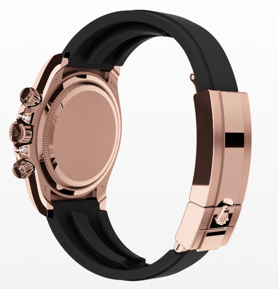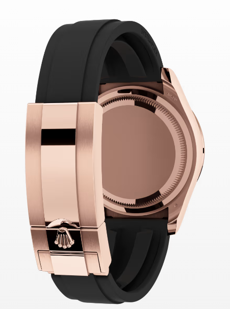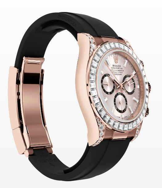 This Oyster Perpetual Cosmograph Daytona in 18 kt Everose gold, with a Sundust, diamond-set dial and contrasting counter rings, features an Oysterflex bracelet as well as a diamond-set bezel and diamond-set lugs.