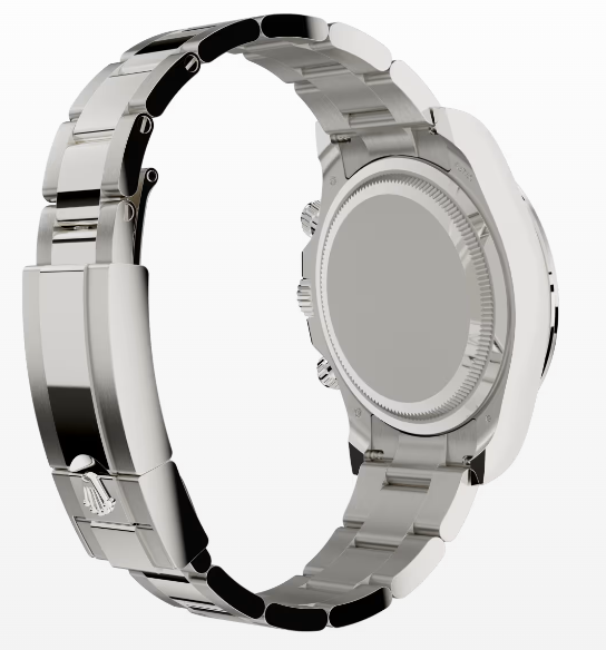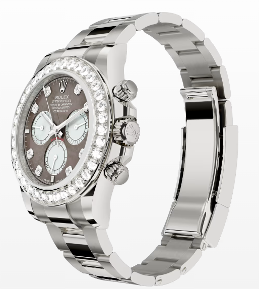 This Oyster Perpetual Cosmograph Daytona in 18 kt white gold, with a black and white mother-of-pearl, diamond-set dial and an Oyster bracelet, features a diamond-set bezel.