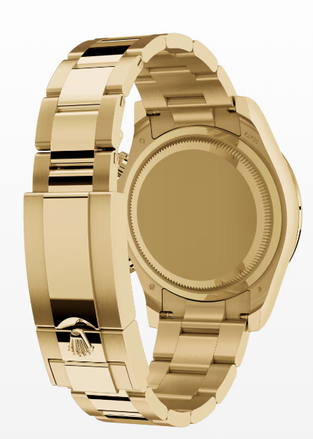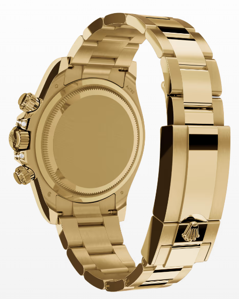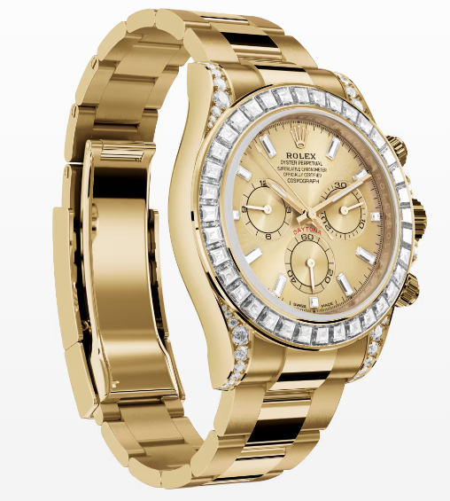 This Oyster Perpetual Cosmograph Daytona in 18 kt yellow gold, with a golden, diamond-set dial and an Oyster bracelet, features a diamond-set bezel and diamond-set lugs.