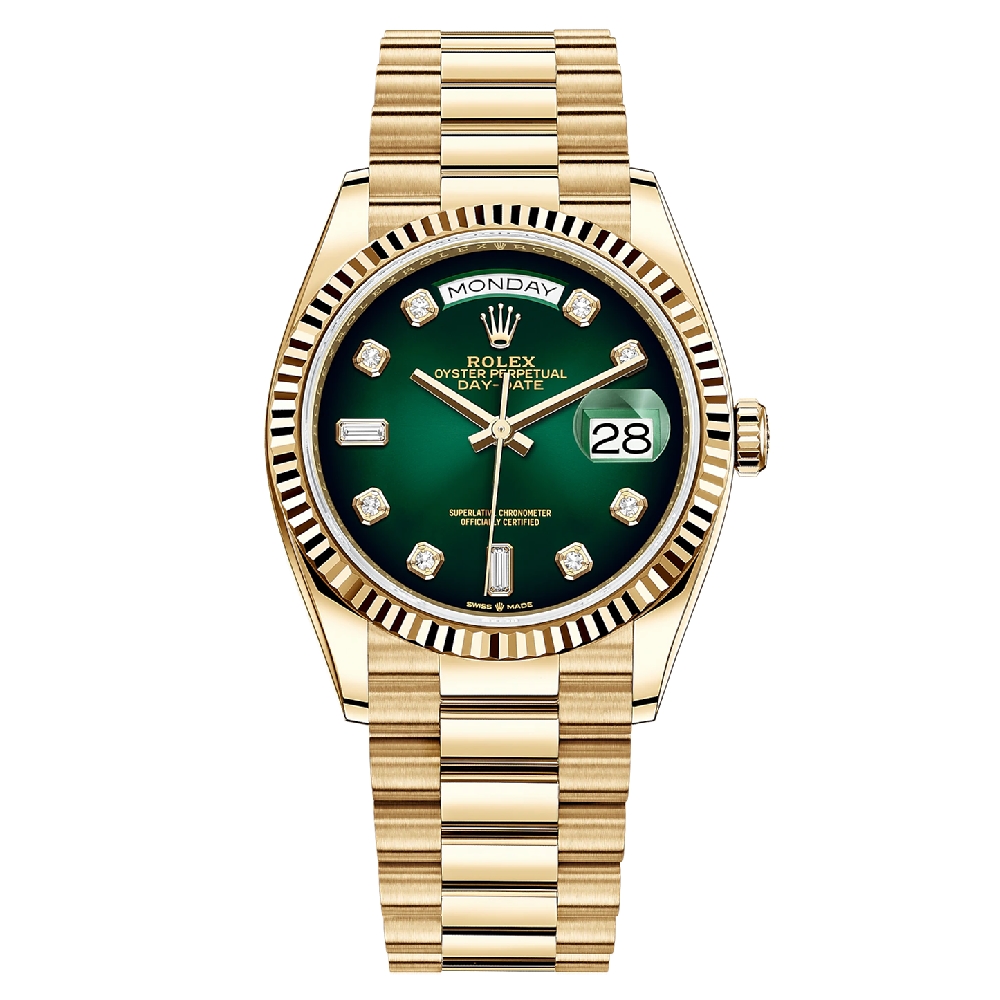 The Rolex fluted bezel is a mark of distinction. Originally, the fluting of the Oyster bezel had a functional purpose: it served to screw the bezel onto the case helping to ensure the waterproofness of the watch. It was therefore identical to the fluting on the case back, which was also screwed onto the case for waterproofness, using specific Rolex tools. Over time, the fluting became an aesthetic element, a genuine Rolex signature feature. Today the fluted bezel is a mark of distinction, in gold on this Day-Date 36.
