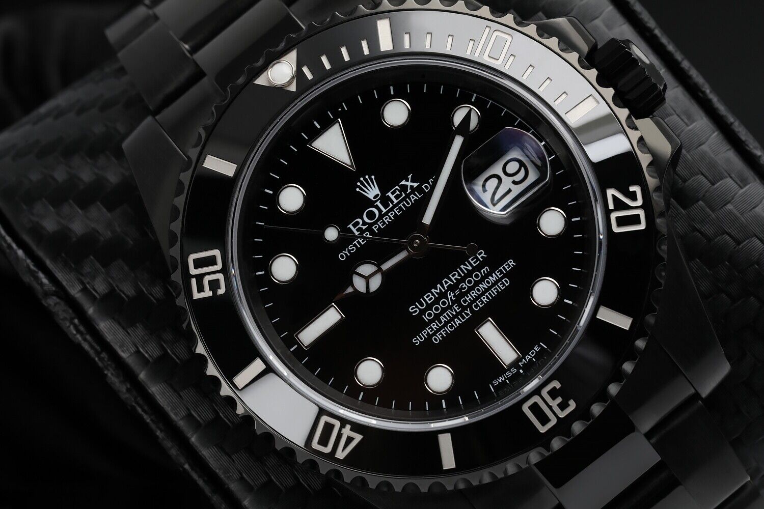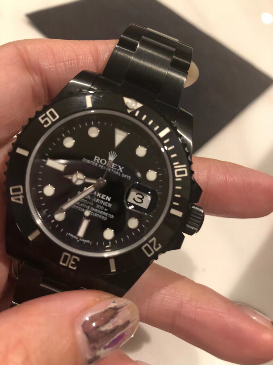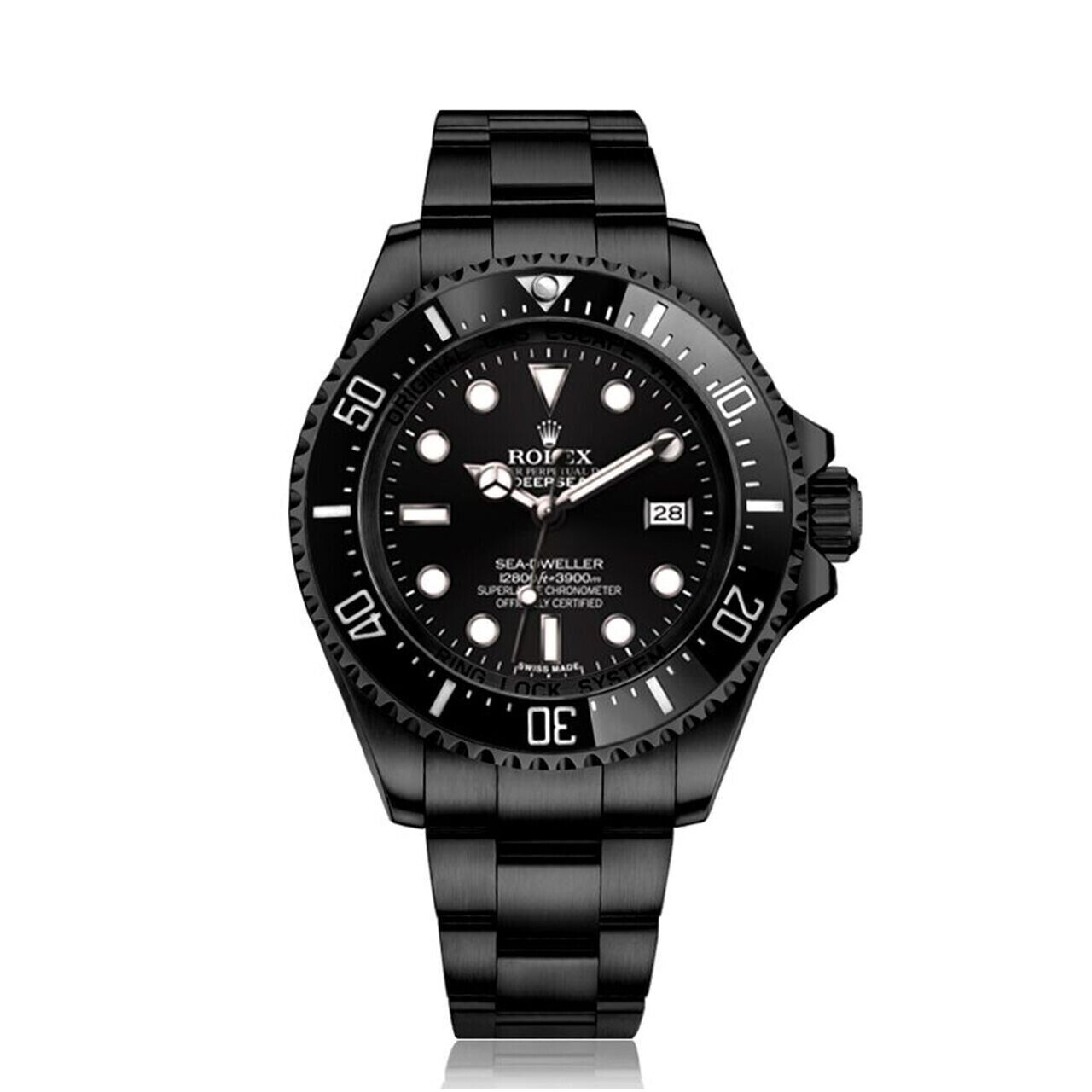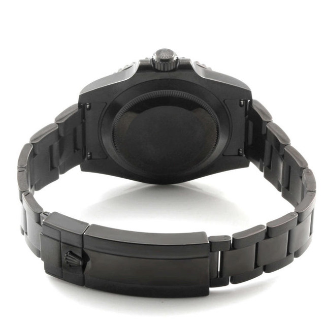 Stainless steel case with a stainless steel Black BOC Coating oyster bracelet. Uni-directional rotating with black cerachrom top bezel. Black dial with hands hands and dot hour markers. Minute markers around the outer rim. Dial Type: Analog. Luminescent hands and hour markers. Calendar display appears at the 3 o'clock position. Automatic movement. Scratch resistant sapphire crystal. Screw down crown. Solid case back. Case diameter: 40 mm. Round case shape. Band width: 20 mm. Deployment clasp. Water resistant at 300 meters / 1000 feet. Functions: hours, minutes, seconds, date. Luxury watch style. Watch label: Swiss Made. Rolex Oyster Perpetual Submariner Black Dial Black Cerachrom Bezel Steel Mens Watch.