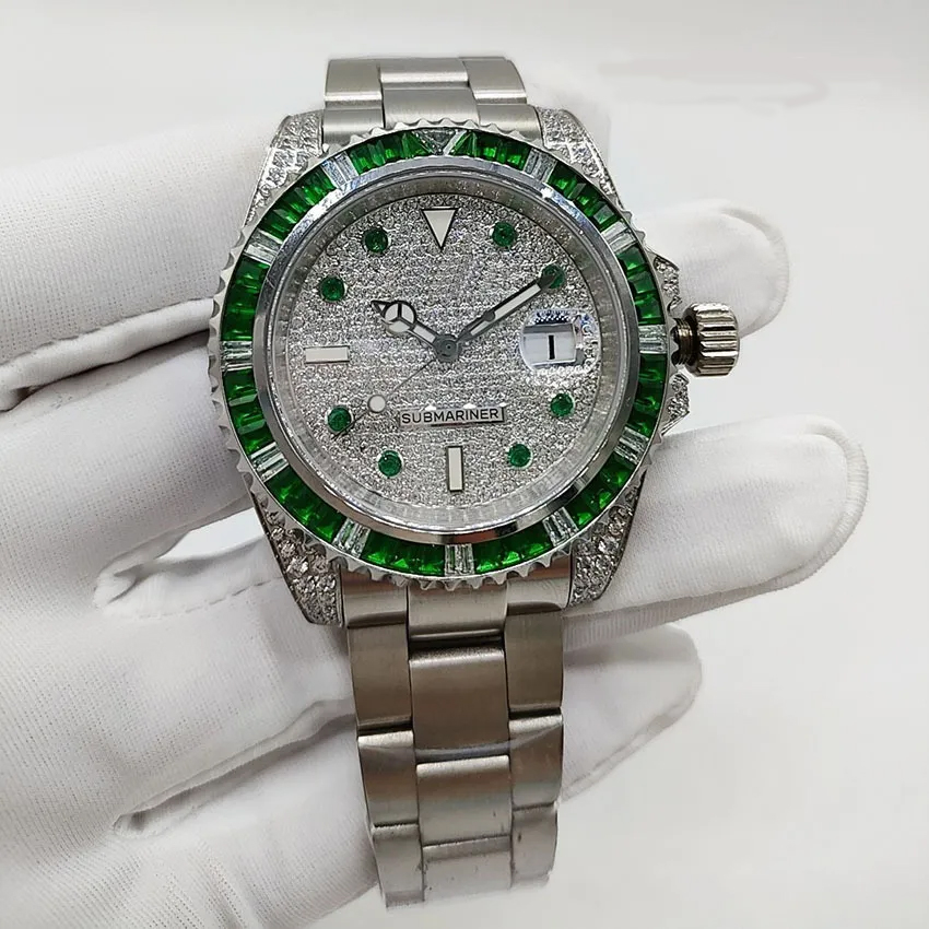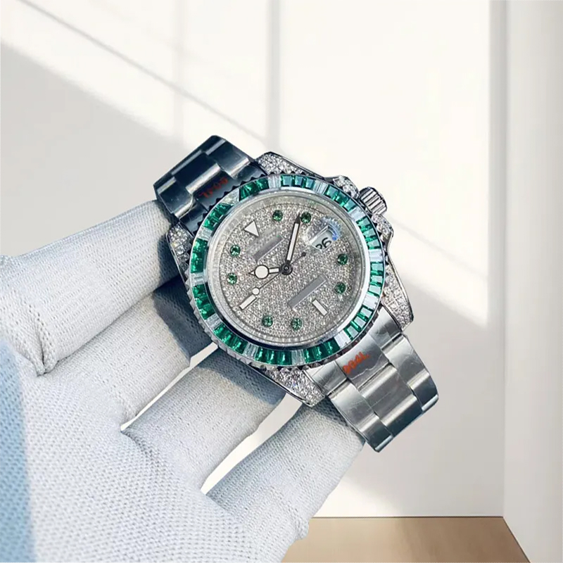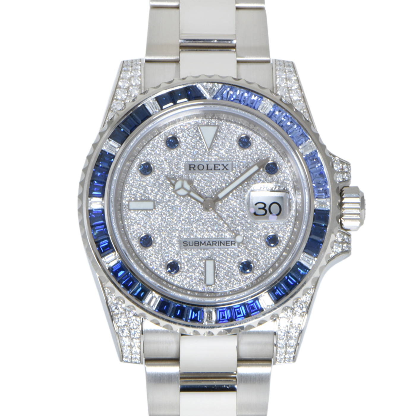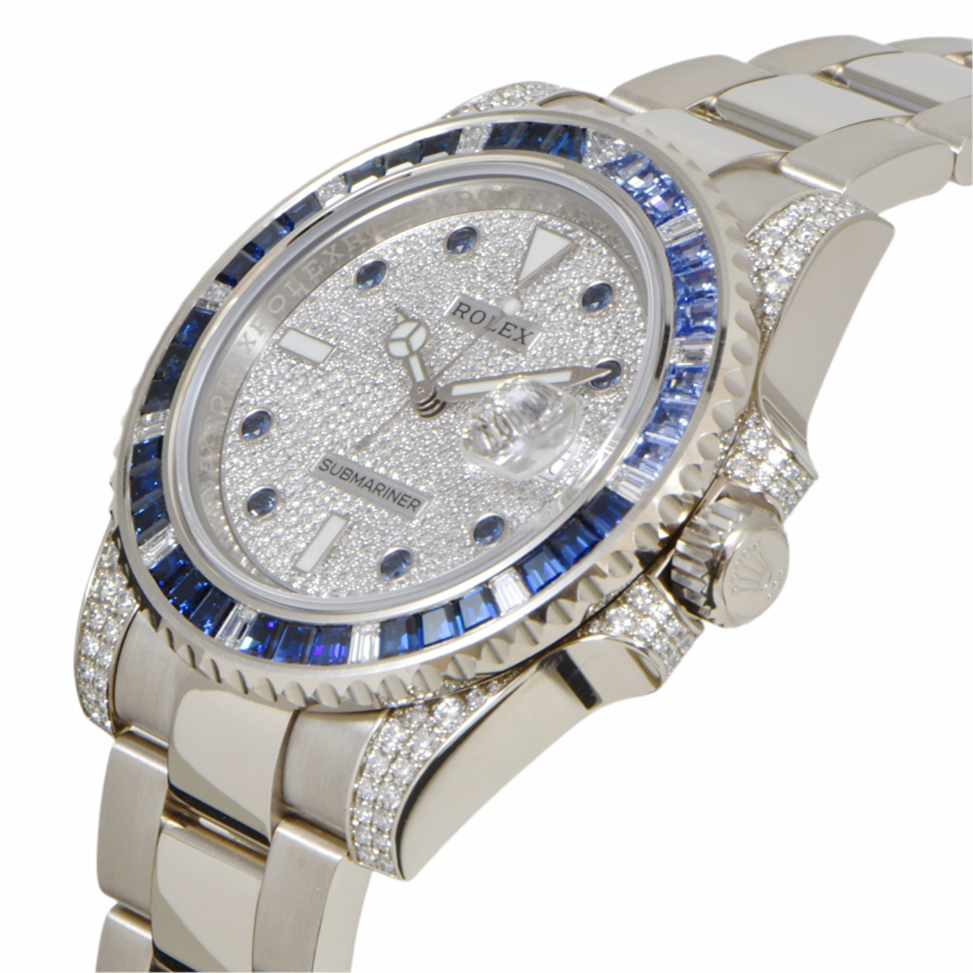Introducing the ultimate luxury timepiece for the modern man - the Men's Diamond Watch Rolex Submariner Sapphires Bezel. This stunning watch combines the iconic design of the Rolex Submariner with the elegance of diamond and sapphire accents, making it a true statement piece. Crafted by the renowned brand Rolex, this watch boasts a 40mm case diameter, making it the perfect size for any wrist. The case is made of high-quality stainless steel, ensuring durability and longevity. The bezel of this watch is adorned with two types of precious stones - diamonds and sapphires. The white diamonds add a touch of sophistication, while the blue sapphires add a pop of color and uniqueness. The combination of these two stones creates a mesmerizing contrast that is sure to catch the eye. The bracelet of this watch is made of the same stainless steel material, featuring the classic Oyster design. This type of bracelet is known for its comfort and durability, making it the perfect choice for everyday wear. The bracelet is also adjustable, ensuring a perfect fit for any wrist size. The dial of this watch is a work of art, featuring a silver tone and adorned with diamonds. The diamonds are carefully placed to create a stunning pattern that adds a touch of luxury to the watch. The dial is protected by a scratch-resistant sapphire crystal, ensuring that it stays in pristine condition for years to come. This watch is not only a fashion statement but also a functional timepiece. It is powered by an automatic movement, ensuring accurate timekeeping. The watch is also water-resistant up to 300 meters, making it suitable for swimming and diving. As with all Rolex watches, this Submariner comes with a 5-year warranty from ItsHot, giving you peace of mind and confidence in your purchase. It is also engravable, making it the perfect gift for a special occasion. These pre-owned Rolex watches are authentic Rolex watches with genuine diamonds, in excellent condition, they are checked for authenticity and basic water resistance. Since the watch is decorated with diamonds and gemstones, it is not recommended to shower or swim with the watch on.